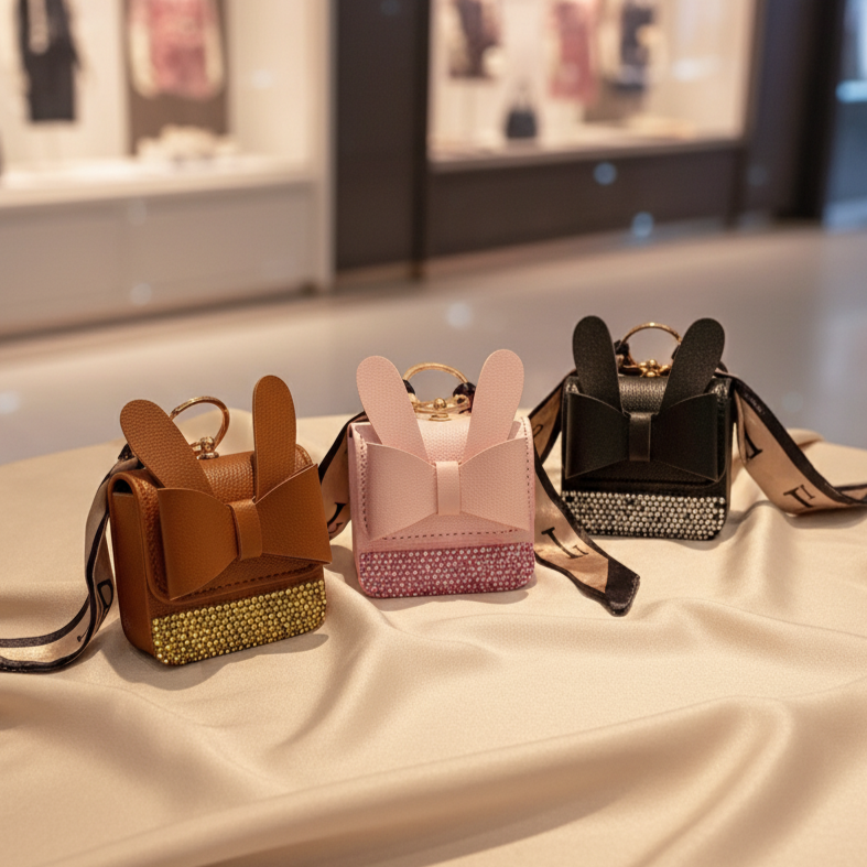 Bunny Ears Mini Bag Keychain | PU Leather Coin Purse with Bow & Rhinestones | Cute Handbag Charm for Women & Girls